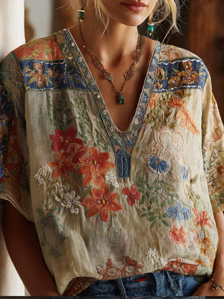 Bohemian Three-dimensional Floral Embroidery Pattern Vintage V-neck Short-sleeved Shirt