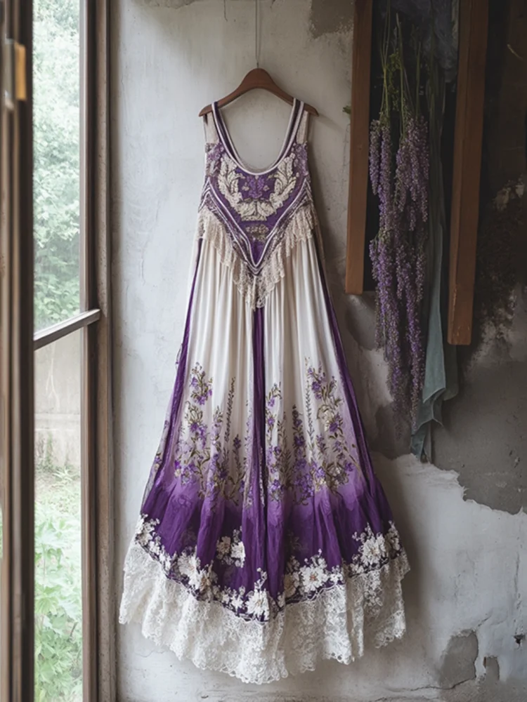 Boho Lavender Embroidered Lace Gradient Linen Dress