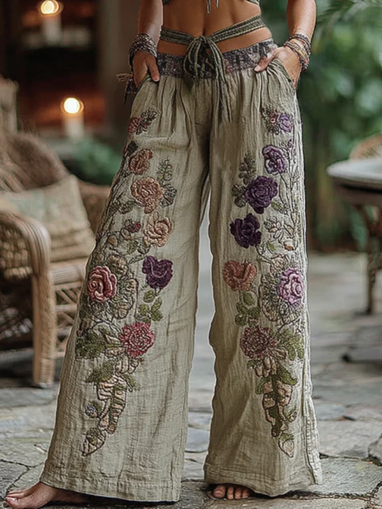 Classy Purple Lavender And Floral Embroidered Art Linen Pants