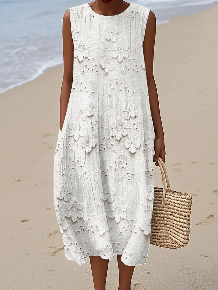 Cottage 3d Floral Embroidered Linen Midi Dress