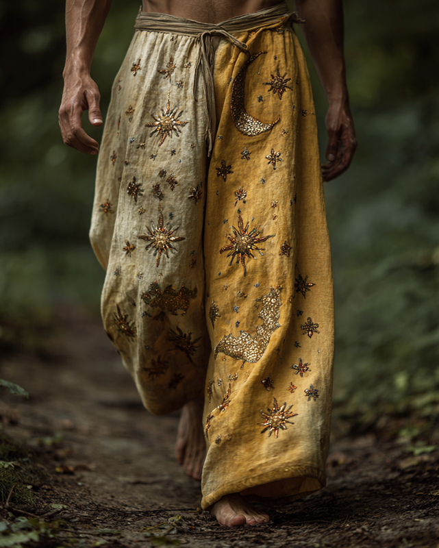 Men's casual star and moon 3D embroidered linen trousers b59f