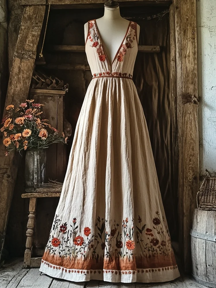 Vintage Boho Floral Embroidered Deep V Neck Linen Maxi Dress