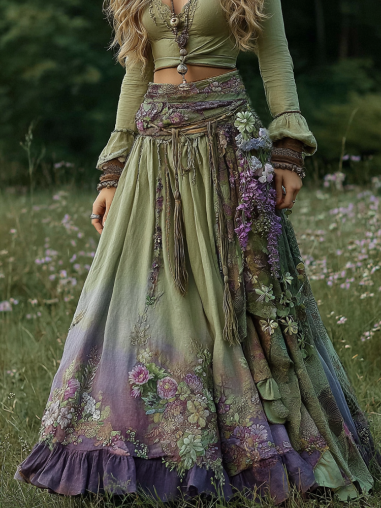 Vintage Boho Purple Floral Patchwork Art Flowy Casual Linen Skirt