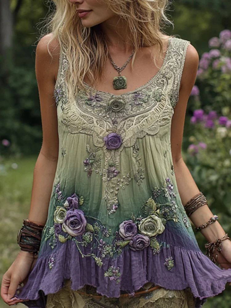 Vintage Classy Gradient Purple Lavender And Floral Embroidered Pattern Linen Tank Top