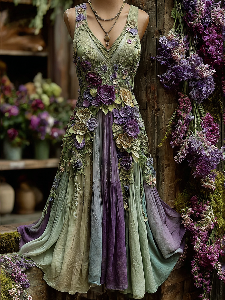 Vintage Classy Gradient Purple Lavender And Floral Embroidered Pattern Linen V Neck Maxi Dress