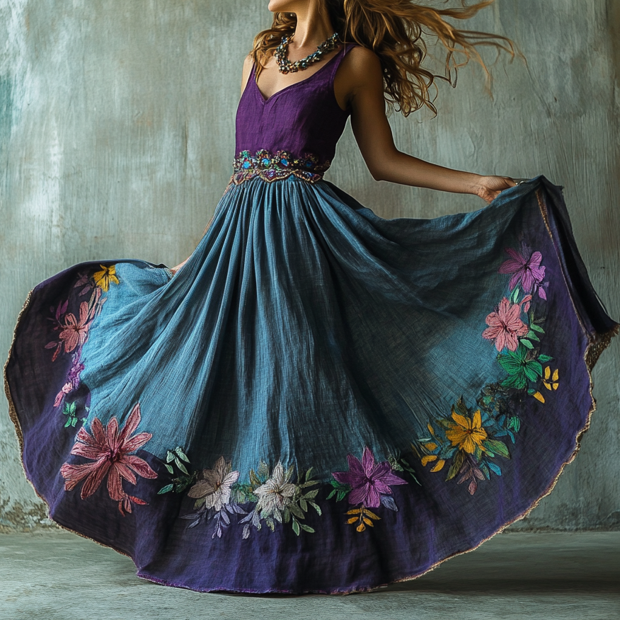 Vintage Floral Embroidered Pattern Art Linen Blend Skirt