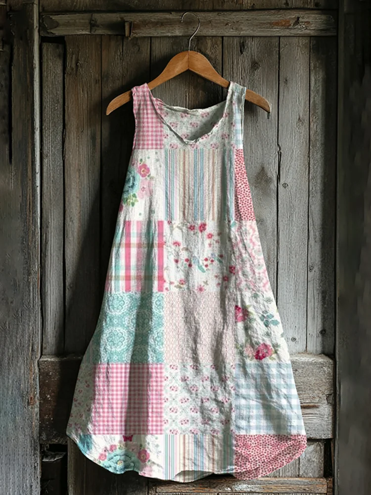 Vintage Floral Geometric Art Linen Blend Tank Dress