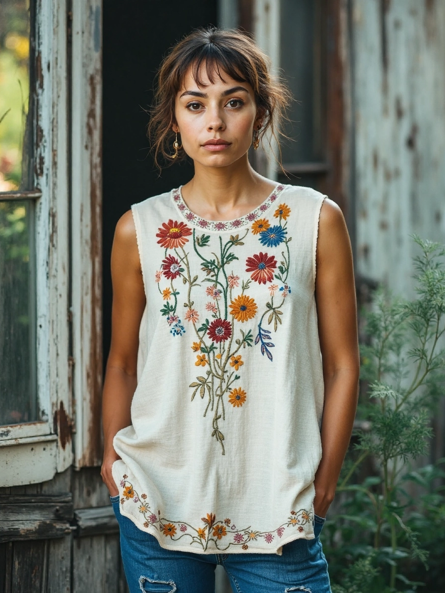 Vintage Flowers Embroidery Art Linen Sleeveless Top