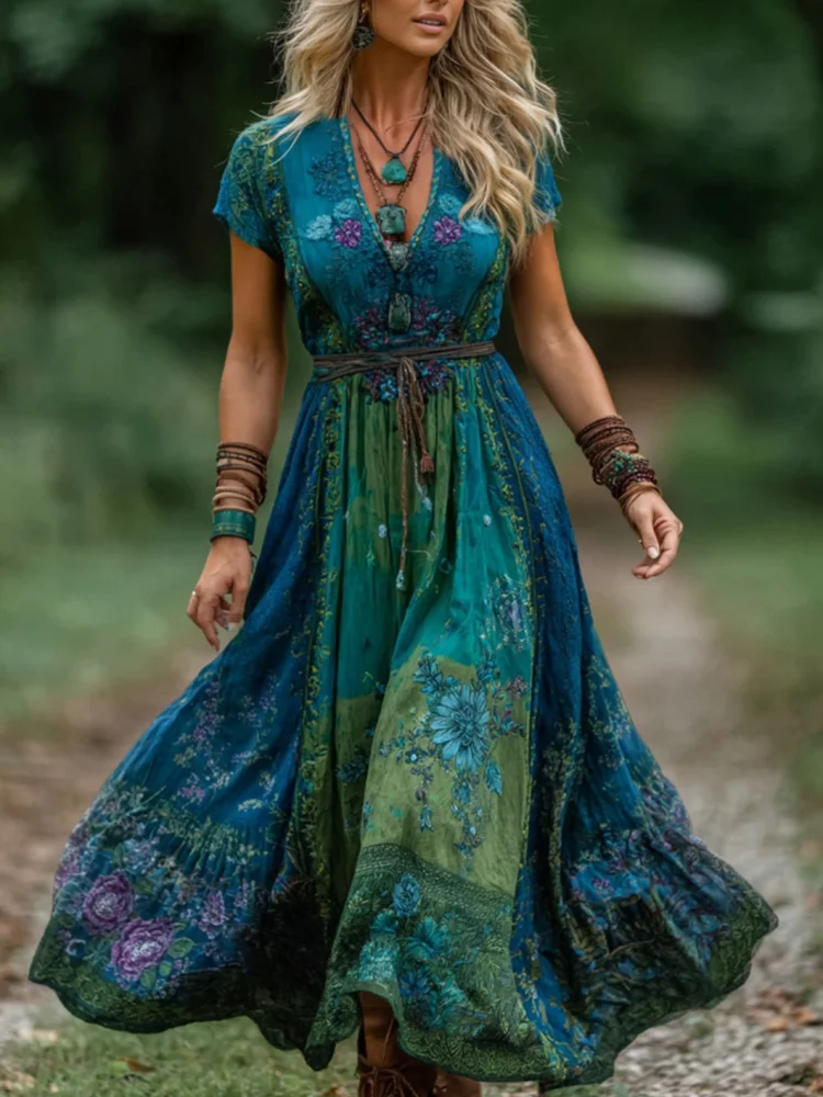 Vintage Gradient Blue Rose And Floral Embroidered Linen Maxi Dress