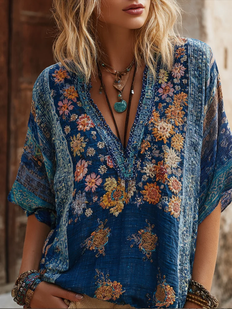 Vintage Knitted Three-dimensional Embroidered Flower V-neck Short-sleeved Shirt