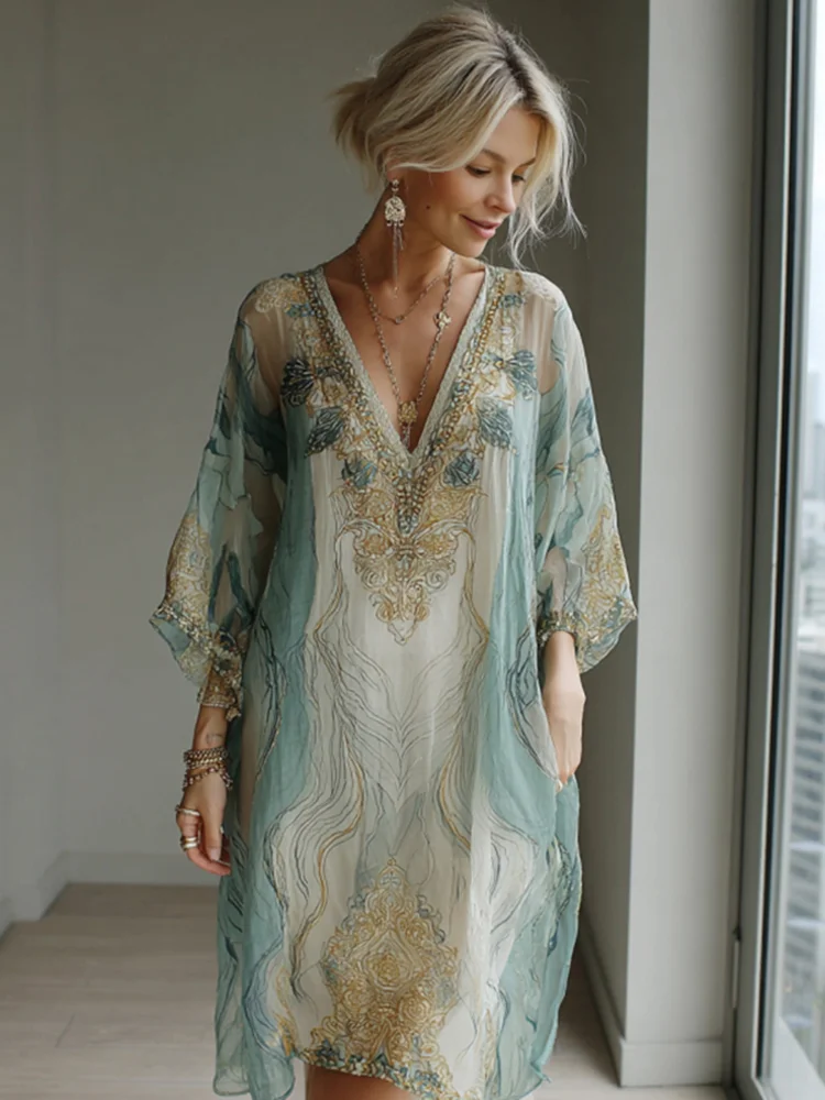 Vintage Marble Texture Collection Retro Bohemia Women Style Gradient Gilded Pattern Linen Dress