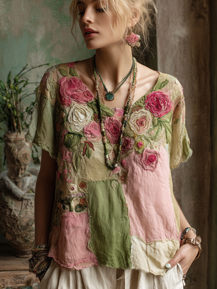 Vintage Pink Roses Patchwork Art Linen Casual Tunic