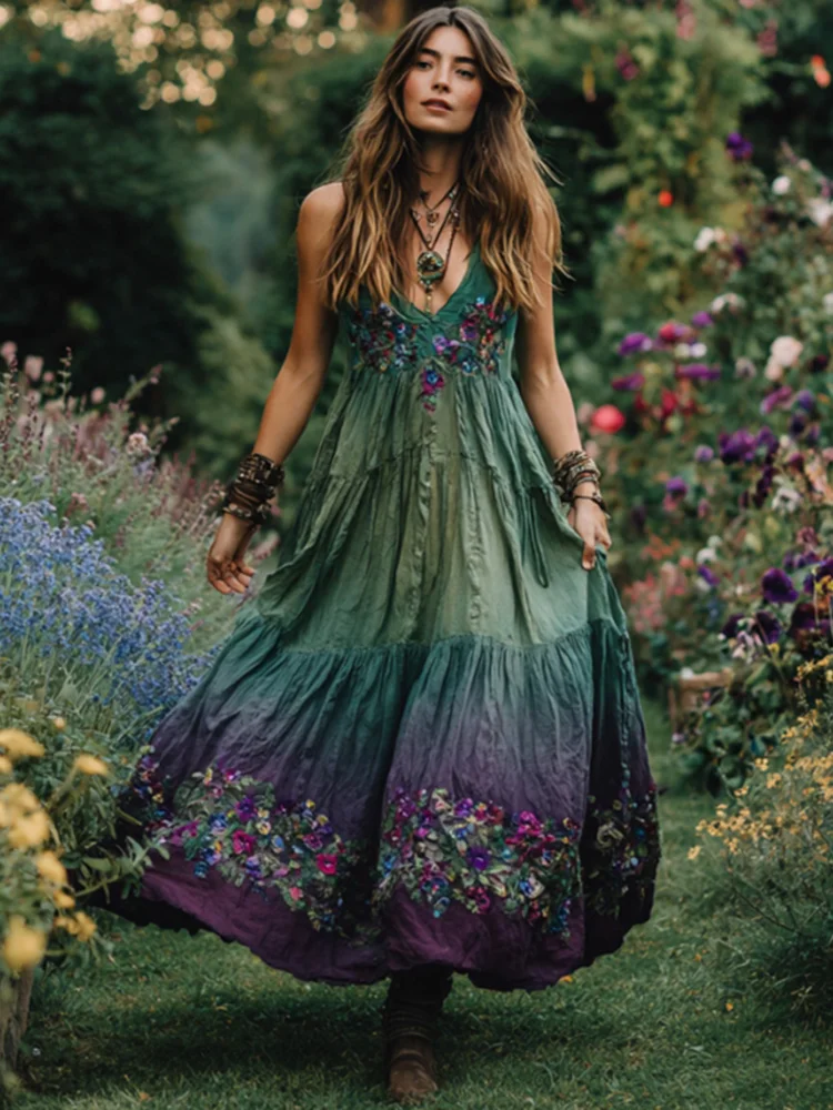 Vintage Purple Flowers Embroidered Gradient Linen Maxi Dress