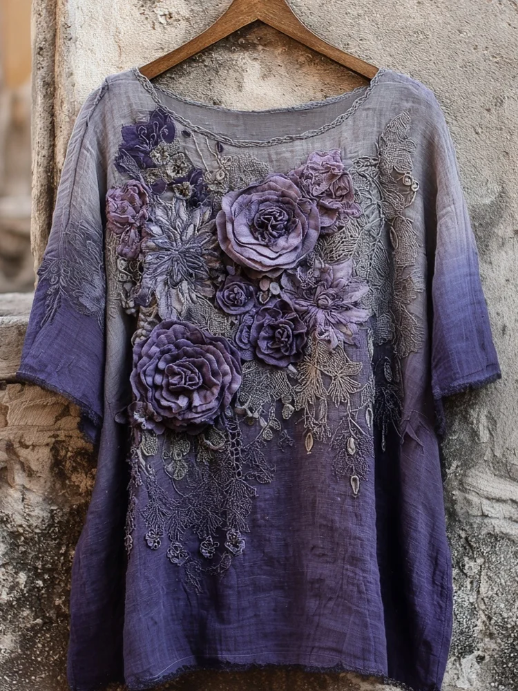 Vintage Purple Roses Embroidered Gradient Linen Tunic