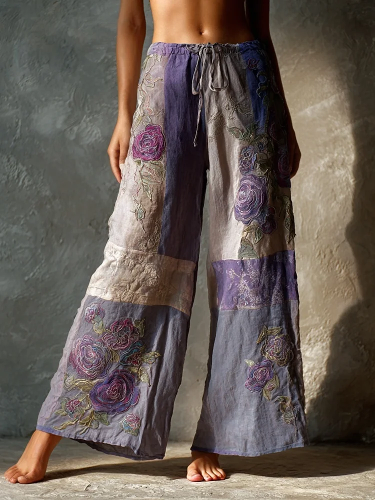 Vintage Purple Roses Embroidered Patchwork Linen Pants