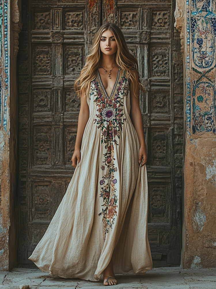 Women Fashion Ethnic Floral Art Sleeveless Dress