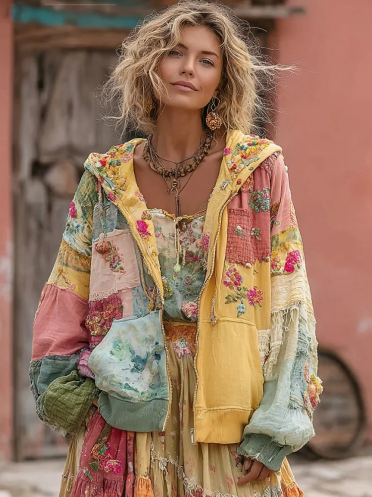 Women's Flower Embroidery Macaroon Color Patchwork Art Zipper Hoodie