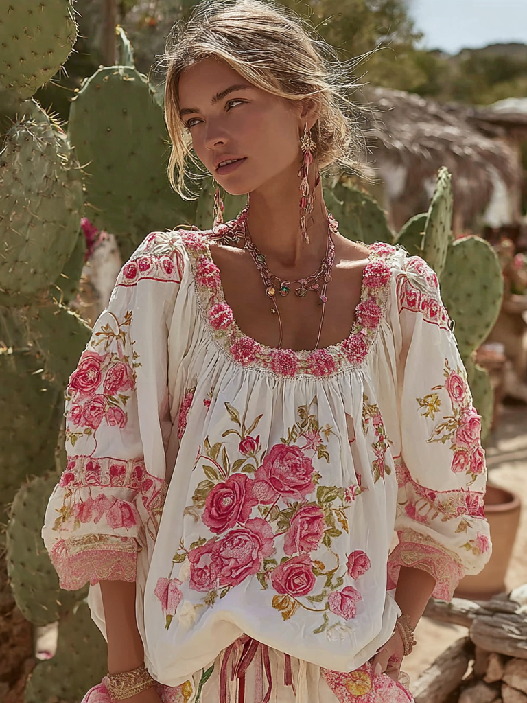 Women's Vintage Floral Embroidered Linen Crew Neck T-shirt