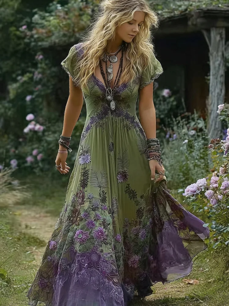 Women's Vintage Gradient Violet Floral Casual V-neck Dress