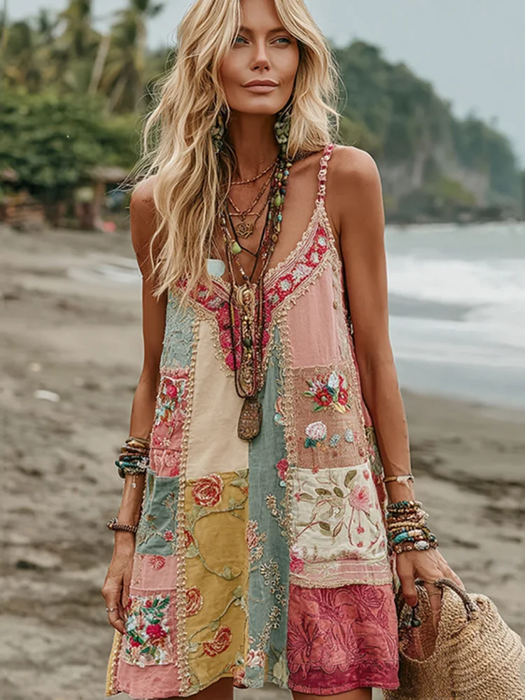 Women's Vintage Rose Floral Art Patchwork Comfy Midi Dress