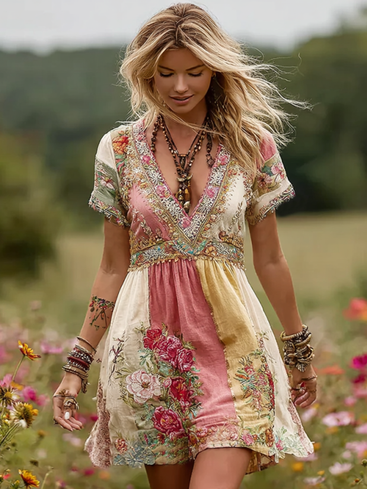 Women's Vintage Rose Floral Art Patchwork Comfy Midi Dress